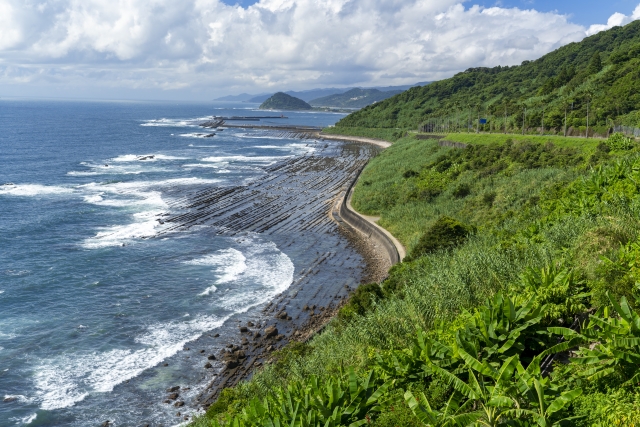宮崎県の地理・地形・地図:日向灘の風に鬼の洗濯板や馬ヶ背の海岸風景。霧島、高千穂の神話の地
